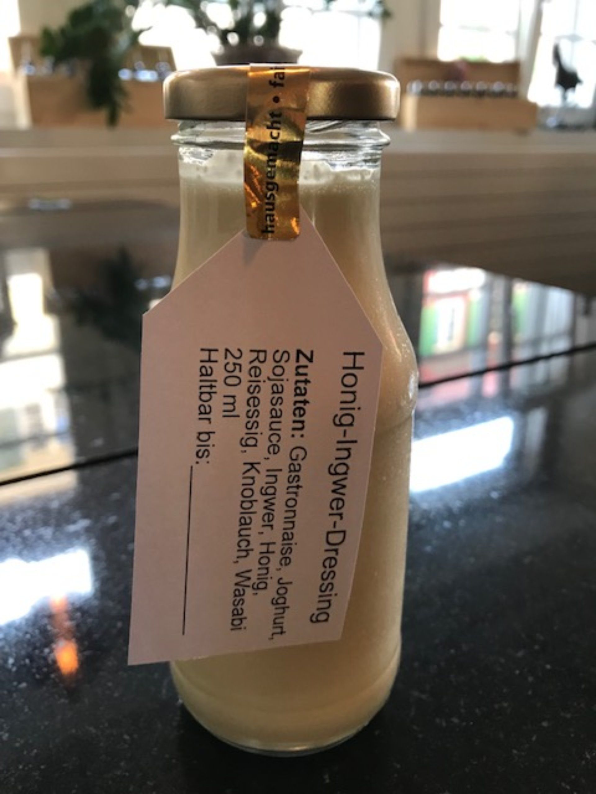 Wir verkaufen auch unsere beliebte Honig-Ingwer-Salatsauce und weitere Saucen im Take-away.
